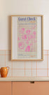 Um pôster divertido e moderno representando um cartão de convidado de restaurante em estilo vintage sobreposto com ilustrações rosa de coquetéis e copos para brindar. A mistura de tipografia e arte gráfica cria um design arrojado e moderno, perfeito para cozinhas, bares ou para quem adora estampas peculiares.