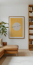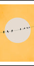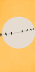 Uma ilustração minimalista e elegante de pássaros em um arame, silhueta contra um fundo circular com um tom amarelo quente. Esta arte gráfica moderna irradia calma e equilíbrio e torna-se uma característica calmante, mas ao mesmo tempo marcante em interiores modernos.