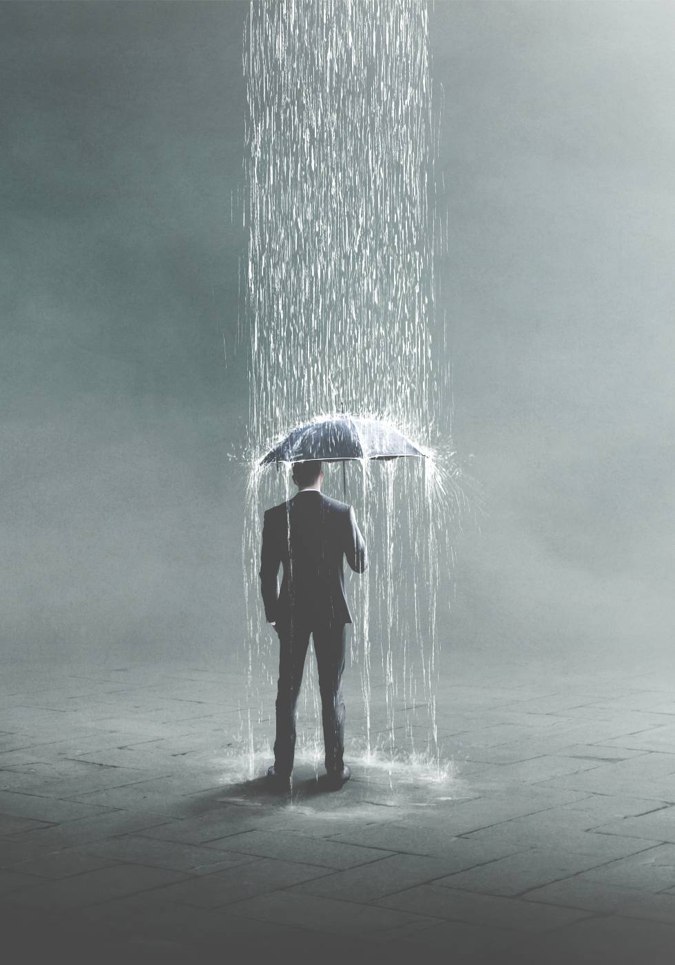 Uma obra de arte surreal de um homem de terno com um guarda-chuva, com a chuva caindo apenas sobre ele. O fundo seco enfatiza a sensação de solidão e pressão psicológica. Uma forte metáfora visual em tons suaves de cinza.