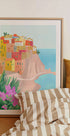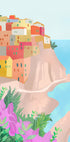 Uma encantadora ilustração inspirada em aquarela de Cinque Terre, Itália. Casas em tons pastéis nas rochas com vista para o mar azul, cercadas por exuberantes plantas e flores. Um motivo perfeito para viajantes e decoração costeira.
