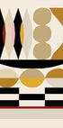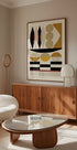 Um distinto pôster abstrato inspirado na Bauhaus com formas geométricas em tons de terra como ocre, bege e preto, complementados por detalhes em vermelho e rosa. As formas limpas e estruturadas criam um equilíbrio visual impressionante que une o minimalismo moderno com o design de meados do século - perfeito para interiores contemporâneos ou paredes de galerias de inspiração retrô.