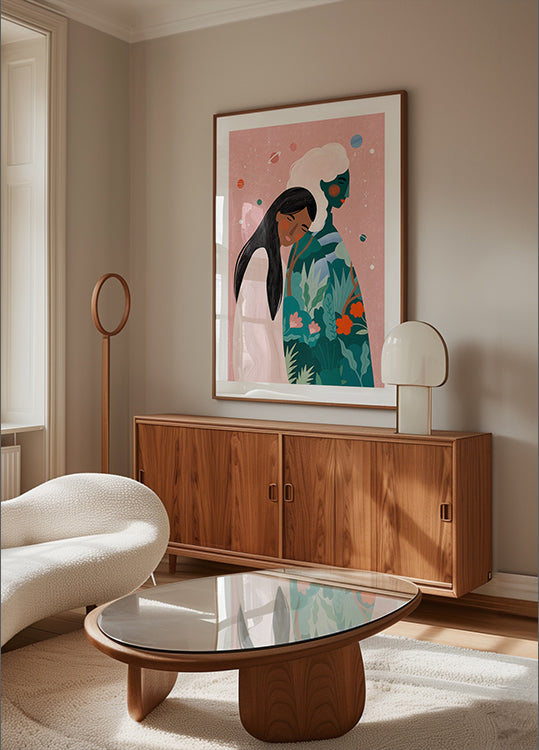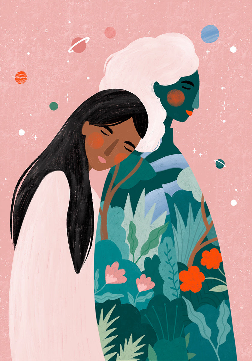 Uma ilustração simbólica e moderna que mostra duas mulheres cercadas por elementos cósmicos e uma natureza exuberante. A obra expressa temas como proteção, maternidade, amizade e harmonia entre as pessoas e a natureza.