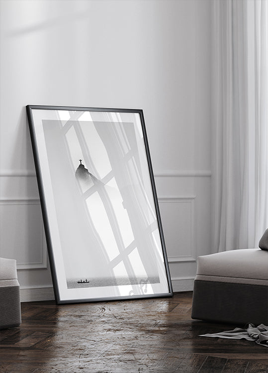 Uma serena fotografia em preto e branco capturando a icônica estátua do Cristo Redentor no Rio de Janeiro, majestosamente acima da neblina. A atmosfera nebulosa cria uma atmosfera espiritual e contemplativa, enquanto um pequeno barco a remo na água enfatiza a escala e a profundidade da cena. Uma obra intemporal que combina a monumentalidade com a serenidade, perfeita para os amantes da fotografia religiosa, arquitetónica e minimalista.