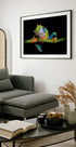 Um close impressionante de uma perereca de olhos vermelhos (Agalychnis callidryas) empoleirada em um caule verde contra um fundo preto profundo. O corpo verde vibrante, os pés laranja e os olhos vermelhos brilhantes criam uma composição fantástica cheia de cor e mistério. Esta impressão macro da natureza é perfeita para amantes de animais, amantes da natureza ou para aqueles que desejam arte de parede ousada e exótica
