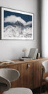 Uma paisagem calma de inverno se desenrola em tons claros e azulados: majestosos picos cobertos de neve erguem-se acima de vales enevoados, enquanto nuvens suaves flutuam no céu. O ambiente clean e descolado convida à contemplação e à tranquilidade. Um olhar poético sobre a força e o silêncio das montanhas, criado por Xiaoyang Wang. Perfeito como um ponto focal tranquilo na sala de estar.