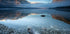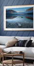 Um poster de paisagem serena do Lago Bohinj, na Eslovénia, onde águas calmas espelham as montanhas e a neblina. A costa límpida com pedras e tronco de árvore realça o ambiente calmo e harmonioso, ideal para criar paz e tranquilidade em qualquer espaço.