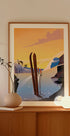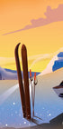 Ski Trip by Nicholas captura a calma antes da corrida noturna: silhuetas de montanhas nevadas são refletidas em um lago tranquilo, enquanto pistas de esqui e bastões verticais sugerem aventura. O gradiente do céu, do laranja quente ao roxo profundo, lança um brilho sonhador sobre a paisagem e convida ao escapismo invernal. Perfeito para sonhadores, desejos de viajar e almas alpinas.