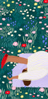 Uma ilustração caprichosa e alegre de uma mulher deitada em um prado cheio de flores coloridas. Com cores vibrantes, detalhes divertidos e uma sensação de relaxamento, esta obra de arte captura a beleza da atenção plena, do verão e dos devaneios na natureza.