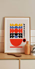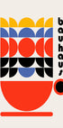 Um pôster colorido inspirado na Bauhaus com formas geométricas dispostas como uma xícara de café. Com fortes elementos vermelhos, amarelos, azuis e pretos, este design retrô traz um toque nostálgico dos anos 70 aos interiores modernos. Perfeito para cozinhas, cafés ou para quem gosta de design vintage com um toque Bauhaus.