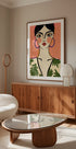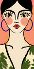 Um pôster de moda alegre e elegante de uma mulher com cílios ousados, brincos grandes e cores elegantes. O fundo cor de pêssego e as texturas pitorescas conferem-lhe uma expressão artística moderna, tornando-a uma peça atraente em interiores modernos.