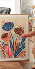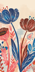 Uma ilustração botânica vibrante com fortes flores vermelhas, azuis e em tons de terra contra um fundo macio e texturizado. A mistura vibrante de cores e formas orgânicas acrescenta calor e charme – uma peça perfeita para iluminar cozinhas, salas de estar ou uma parede de quadros moderna.
