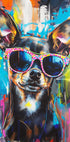 Um retrato vibrante de arte pop de rua de um Chihuahua usando óculos de sol coloridos, pintado com traços ousados inspirados em graffiti. Esta obra de arte lúdica e moderna combina humor, estilo e energia urbana para adicionar uma vibração divertida e ousada a qualquer espaço.