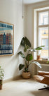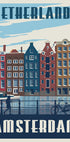 Capture a atmosfera de Amsterdã com um pôster de viagem elegante: casas coloridas de canal com empenas clássicas são refletidas na água, uma bicicleta está apoiada na grade da ponte e pequenos barcos deslizam sob um céu suave da noite. Gráfico, minimalista e icônico – um atrativo que traz o charme da cidade grande para casa. O título AMSTERDAM é claramente visível como texto gráfico.