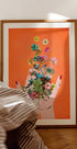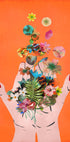 Uma obra de arte vibrante e imaginativa com mãos liberando flores e folhagens coloridas contra um fundo laranja forte. A colagem digital une natureza e arte figurativa para criar uma ilustração floral atraente que simboliza liberdade, criatividade e beleza.