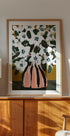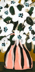 Uma natureza morta floral ousada e elegante com flores brancas em um vaso rosa listrado. Com charme de inspiração vintage e cores pastéis, a obra de arte equilibra o estilo gráfico moderno com suavidade botânica, perfeita como decoração em interiores modernos e elegantes.