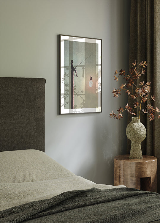 Um pôster de arte surreal e instigante que retrata um pescador solitário empoleirado em uma vara, pescando uma lâmpada incandescente. Este motivo imaginativo simboliza criatividade, inspiração e a busca por novas ideias — perfeito para um ambiente de trabalho ou criativo.