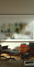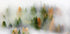 Uma vista aérea sonhadora de uma floresta enevoada de outono, onde copas coloridas de árvores em verde, laranja e dourado rompem as camadas de névoa. A névoa suave cria uma atmosfera mágica, quase surreal, que captura a beleza tranquila e mutável da natureza. Perfeito para adicionar uma atmosfera relaxante e poética a qualquer ambiente.