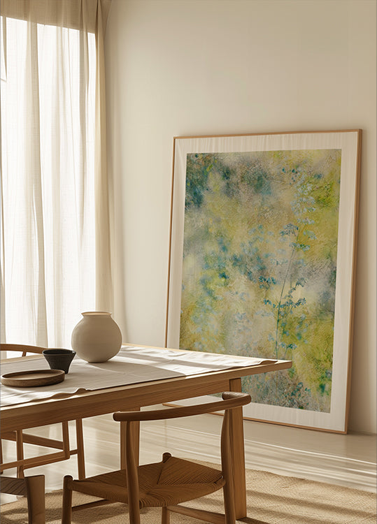 Uma delicada obra de arte impressionista que combina formas botânicas com suaves texturas pictóricas. Delicados tons de verde, azul e amarelo dourado criam uma atmosfera sonhadora e pacífica que captura a beleza fugaz da natureza. Perfeito para adicionar uma vibração relaxante e artística a qualquer ambiente