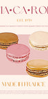 Pôster de macaron francês com bolos coloridos à base de merengue, destacando suas origens e estabelecimento em 1959. O design destaca produtos assados tradicionais, cores vibrantes e arte da confeitaria francesa.