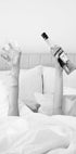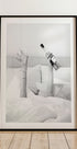 Uma divertida impressão artística em preto e branco mostrando mãos segurando uma garrafa de Aperol e uma taça de vinho sobre lençóis brancos e macios. Minimalista mas marcante – uma obra de arte bem-humorada e elegante, perfeita para interiores modernos, cozinhas, bares ou quartos com um pouco mais de personalidade.