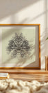Um padrão gráfico e espelhado de galhos forma uma silhueta hipnótica que lembra um teste de Rorschach. As linhas orgânicas criam novas figuras a cada olhar e convidam à interpretação. O fundo limpo e claro dá espaço ao motivo e torna o trabalho de Nadav Jonas uma afirmação forte e moderna na casa.