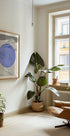 Blue Echoes de Athene Fritsch une minimalismo descolado com poesia gráfica: uma silhueta de montanha em preto e branco é quebrada por círculos concêntricos e azuis profundos que enviam ecos visuais através de uma paisagem gelada. Uma afirmação moderna e geométrica com energia calma, contraste nítido e elegância invernal. Perfeito como ponto focal na sala ou no escritório.