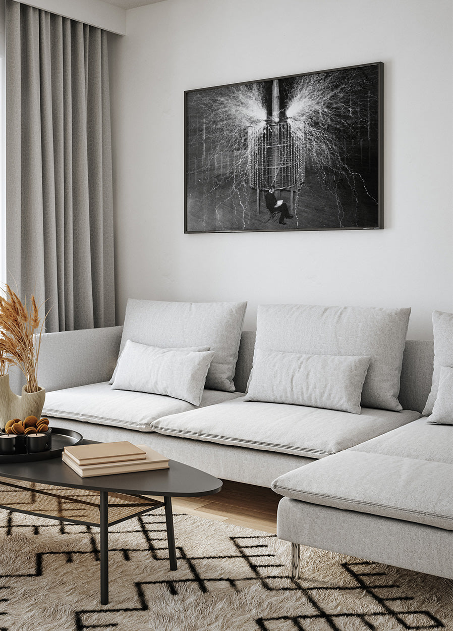 Pôster de Nikola Tesla sobre eletricidade em laboratório