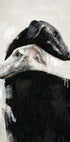 Uma expressiva pintura digital de dois galgos em um abraço amoroso, seus corpos sobrepostos em uma pose terna. A obra combina retratos realistas de cães com pinceladas abstratas e detalhes florais, criando um equilíbrio harmonioso entre emoção e arte. Uma peça comovente que simboliza amor, apego e amizade.