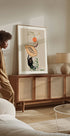 Uma ilustração abstrata moderna de frutas tropicais como mamão, figo e frutas cítricas, equilibradas elegantemente sobre uma mão estilizada. Com tons terrosos e contornos marcantes, a obra celebra o frescor, a natureza e a beleza viva do dia a dia. Uma peça perfeita para cozinhas e interiores modernos.