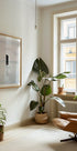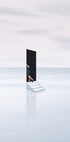 Uma obra de arte conceitual surreal que retrata uma pessoa atravessando uma porta escura sobre águas calmas e reflexivas. O arranjo minimalista, com uma escada que leva ao nada, evoca temas como fuga, partida e novos começos. A cena mistura surrealismo onírico com estética inspirada em meados do século.