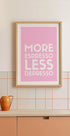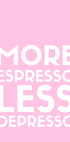 Um pôster de tipografia minimalista e divertido com texto branco em um fundo rosa suave. A divertida frase "Mais Espresso Menos Depresso" traz humor e motivação, perfeita para os amantes do café e da decoração moderna da casa. Uma declaração divertida para cozinhas, cafés ou escritórios.