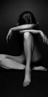 Uma forte fotografia artística em preto e branco de uma mulher sentada expressando emoção crua, sensualidade e vulnerabilidade. Com iluminação dramática e expressão monocromática, a obra evoca temas de tristeza, força e melancolia, tornando-se uma atraente peça de arte figurativa de parede.