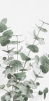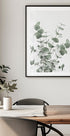 Uma obra de arte botânica minimalista com folhas de eucalipto contra um fundo branco limpo. As sombras suaves e os tons naturais de verde criam uma peça de arte de parede fresca e calmante, perfeita para interiores modernos, design escandinavo ou espaços inspirados na natureza.