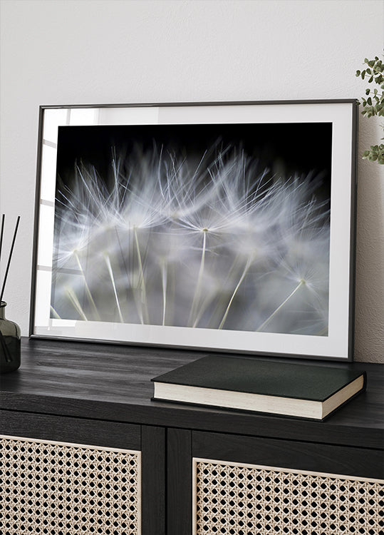 Uma delicada fotografia macro de sementes de dente-de-leão, capturando sua suavidade e beleza. O close-up destaca a natureza frágil e fugaz desses tufos arejados.
