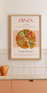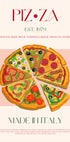 Esta obra de arte de inspiração retrô mostra uma ilustração colorida de pizza fatiada com várias coberturas, como azeitonas e calabresa. Com o texto “PIZZA” fundado em 1979, destaca massas frescas, caseiras e autênticas origens italianas.