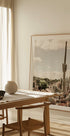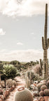 Uma paisagem serena inspirada no deserto, com cactos altos e suculentas exuberantes sob um céu suave e nublado. Esta fotografia botânica capta a beleza tranquila de uma fazenda de cactos, com texturas naturais, tons de terra e uma calma atemporal. Uma impressão perfeita para os amantes da natureza e das plantas.