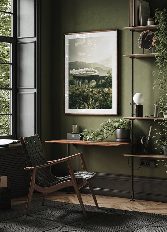 Uma fotografia impressionante do Viaduto Glenfinnan, onde um antigo trem a vapor atravessa a ponte histórica nas Terras Altas da Escócia. A paisagem nebulosa e a luz dramática criam uma atmosfera mágica e nostálgica. Perfeito para entusiastas de viagens, amantes de trens e para aqueles que apreciam paisagens naturais icônicas.