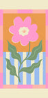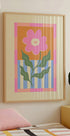O divertido pôster de flor rosa é uma ilustração de flor charmosa e alegre com um design de inspiração retrô. Mostra uma grande flor rosa claro com pétalas macias e folhas verdes, contra um fundo laranja quente com listras azuis e brancas, emoldurado por uma borda xadrez rosa. A composição exala otimismo e diversão, tornando-a perfeita para interiores modernos, ecléticos ou de inspiração vintage. Ideal para iluminar cozinhas, quartos ou espaços criativos, acrescenta um toque de cor e alegria a qualquer parede de quadros.