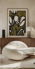 As tulipas abstratas de Janel Bragg dançam em tons de verde musgo, onde linhas de tinta preta serpenteiam como traços elegantes sobre um campo verde oliva. A composição equilibra o romantismo sombrio e o Zen moderno – enérgico mas calmante – uma afirmação botânica poética para a sala de estar, quarto ou escritório. Cria calma e presença na sala.
