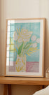 Uma pintura pastel suave de flores em um vaso, com finas linhas amarelas e folhas verdes contra um fundo turquesa suave. Esta pitoresca obra de arte proporciona uma vibração fresca e leve, perfeita para adicionar um toque floral tranquilo a qualquer ambiente.