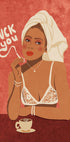 Brave Attitude Coffee Poster é uma impressão artística distinta e poderosa que combina glamour vintage com confiança sem reservas. Mostra uma mulher confiante em sutiã de renda branca, com pérolas e turbante de toalha, saboreando seu café e cigarro enquanto a ousada mensagem “F*** You” surge da fumaça. Com tons quentes de vermelho, esta obra de arte provocante, mas elegante, faz uma declaração destemida – perfeita para adicionar personalidade e ousadia a interiores modernos, cafés ou paredes de arte com atitude.