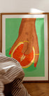Pôster Toque de Toranja é uma obra de arte moderna marcante e provocativa que explora temas de sensualidade, força e rebelião lúdica. Mostra uma mão de pele morena escura, adornada com anéis de ouro e ousadas unhas pintadas de vermelho, emoldurando uma toranja cortada ao meio, num gesto simbólico e sugestivo. Sobre um fundo verde fresco e texturizado, os tons quentes da mão e da fruta criam um contraste cativante. Esta peça ousada é perfeita para espaços contemporâneos que abraçam a positividade corporal, a autoexpressão e a confiança incondicional.