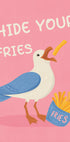 Uma ilustração maluca e bem-humorada de uma gaivota roubando batatas fritas, com o texto divertido “Hide Your Fries”. Trazendo vibrações de praia e charme atrevido para dentro de casa, este pôster colorido é perfeito para a cozinha, quarto de criança ou interiores que abraçam humor e design de luz.