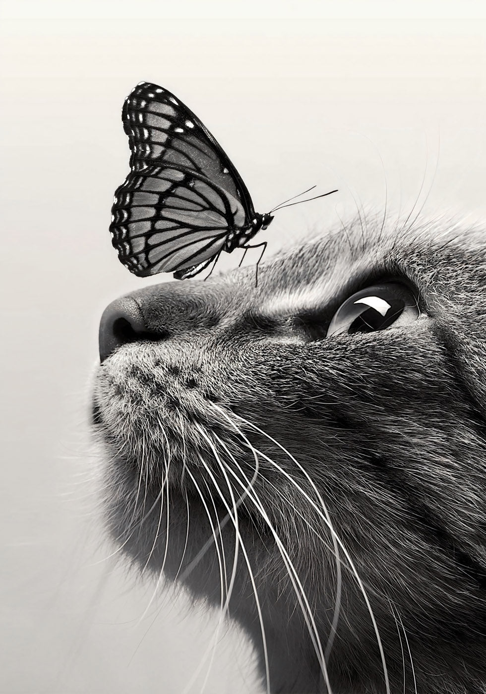 Uma comovente imagem em preto e branco que captura um momento de curiosidade entre um gato e uma borboleta. Os grandes olhos do gato e as delicadas asas da borboleta criam uma composição artística e relaxante. Perfeito para amantes de animais e decoração minimalista.