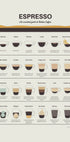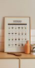 Um pôster detalhado de café expresso com uma visão geral ilustrada das bebidas clássicas de café italiano. Do expresso e doppio ao cappuccino, latte e affogato – este poster de cozinha é ao mesmo tempo educativo e elegante. Arte de parede perfeita para cafés, cafeterias e cozinhas domésticas.