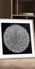 hipnose de Giorgio Toniolo é uma composição gráfica monocromática em que círculos e anéis concêntricos formam um padrão simétrico, quase esférico, com forte contraste. As proporções inspiradas em Fibonacci e a geometria compacta criam uma profundidade hipnótica e um pulso óptico calmo e minimalista. A esfera gráfica equilibra-se entre ordem e ilusão.