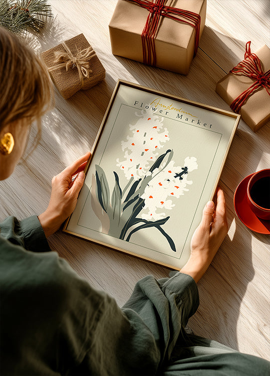 Uma homenagem gráfica a Amsterdã: um jacinto estilizado se destaca como um ícone do mercado, cercado por uma tipografia ousada e tons nórdicos descolados. O pôster equilibra a tranquilidade invernal com a promessa da primavera. Projetado por Annick e criado para dar à sua casa um foco botânico fresco com charme elegante e moderno. Em tom escandinavo.