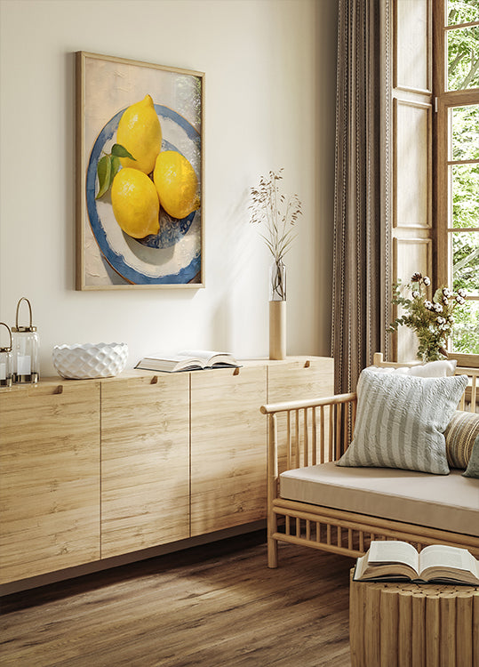 Uma natureza morta clássica com três limões amarelos e folhas verdes num prato com borda azul. As pinceladas suaves e as cores quentes criam uma atmosfera mediterrânea calma.
