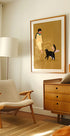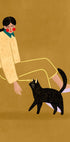 Uma ilustração moderna de uma mulher e seu gato preto, desenhada em tons neutros e quentes com uma estética minimalista, mas estilizada. Esta obra de arte irradia aconchego, comunidade e amor – perfeita para lares com amantes de gatos.