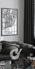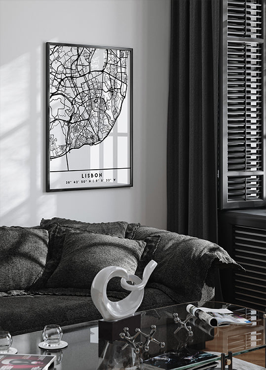Black Maps 39 é o elegante tributo de Emiliano Deificus a Lisboa: uma composição monocromática de mapa da cidade onde ruas, bairros e linhas de rios desenham um ritmo geométrico nítido. O contraste enfatiza a precisão das coordenadas e o dinamismo da cidade e cria uma expressão gráfica moderna para a casa urbana. Perfeito para decoração minimalista.